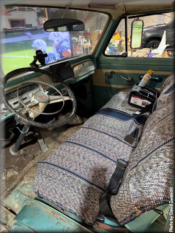 I also want to know what correct seat belts looked like and if they are color-coded to match the upholstery on a deluxe FC or are they black? I'd also like to know whether the spare tire cover was black or color-coded. Finally, I'd like to have a picture of the correct dash, including the steering column w/ deluxe horn ring."
